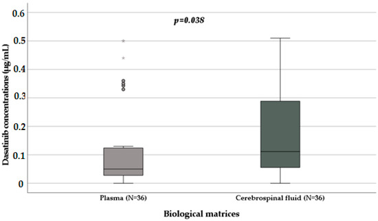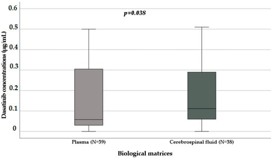 Seventy-seven patients were treated with dasatinib, and they were all men. The median age was 13 years (IQR 12–17 years), and 72 patients (93.5%) were paediatrics. The median plasma concentration collected in 39 patients was 0.06 µg/mL (IQR 0.03–0.33 µg/mL); the median CSF level collected in 38 patients was 0.11 µg/mL (IQR 0.06–0.32 µg/mL). Considering plasma and CSF matrices, a statistically significant influence was observed on drug concentrations (p = 0.038): plasma levels (N = 39; median 0.06 µg/mL, IQR 0.03–0.33 µg/mL) are lower than CSF levels (N = 38; median 0.11 µg/mL, IQR 0.06–0.32 µg/mL) as shown in Figure 2.