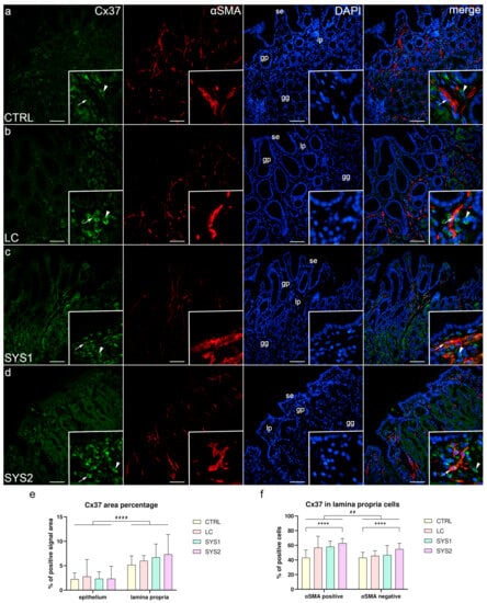 The surface epithelium, gastric pits, and superficial parts of gastric glands of CTRL samples showed weak Cx37 staining, mainly in their basal membrane. However, some cells of the deeper parts of gastric glands displayed moderate Cx37 staining., while several cells in the lamina propria, both αSMA-positive and αSMA-negative, demonstrated strong Cx37 staining (Figure 1a). In LC samples, Cx37 had a similar expression pattern in the epithelium, gastric glands, and lamina propria to CTRL samples, with a slightly higher proportion of αSMA-positive cells also co-expressing Cx37 (Figure 1b). Cx37 expression in SYS1 samples was almost identical to LC samples, in both epithelial and lamina propria cells (Figure 1c). While the surface and glandular epithelium of SYS2 samples showed no differences in Cx37 staining compared to other sample groups, the lamina propria had the highest proportion of Cx37-positive cells (Figure 1d). While statistical analysis of the Cx37 area percentage of all samples showed no significant differences between sample groups, the lamina propria had a significantly higher (p < 0.0001) area percentage compared to the epithelium across all sample groups (Figure 1e). While the proportion of Cx37-positive lamina propria cells increased with the severity of SSc, only SYS2 samples showed a significantly higher proportion (p < 0.0001) compared to CTRL samples, for both αSMA-positive and -negative cells. αSMA-positive cells had significantly higher (p = 0.001) Cx37 positivity compared to αSMA-negative cells when analyzing across all sample groups (Figure 1f).