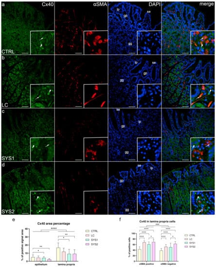 Co-expression of Cx40 and αSMA in the gastric mucosa of patients with SSc. CTRL—control samples from healthy volunteers (a); LC—samples from patients with limited cutaneous SSc (b); SYS1—samples from patients with moderate diffuse cutaneous SSc (c); SYS2—samples from patients with severe diffuse cutaneous SSc (d). se, surface epithelium; gp, gastric pits; gg, gastric glands; lp, lamina propria. Insets display Cx40 expression in lamina propria cells (a–d). Arrows mark αSMA-positive cells expressing Cx40, while arrowheads demonstrate αSMA-negative cells with Cx40 expression (a–d). DAPI staining shows all cell nuclei (a–d). Double immunofluorescence staining for Cx40 and αSMA, 200× magnification, scale bars: 200 µm. The graphs display differences in Cx40 area percentage of epithelium and lamina propria (e), as well as differences between αSMA-positive and -negative cells of the lamina propria (f). Error bars mark the standard deviation. Asterisks (*) symbolize significant differences between sample groups, while hashes (#) represent differences between analyzed regions/cells. * p < 0.05, ** p < 0.01, ### p < 0.001, ****/#### p < 0.0001.