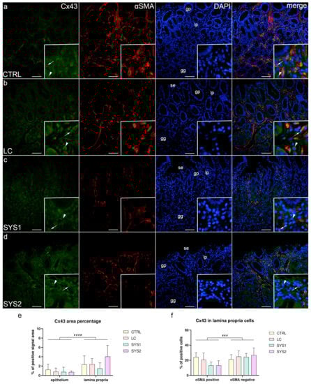 In all sample groups, almost all epithelial structures of the gastric mucosa were negative for Cx43 staining, with the exception of some cells of the deeper parts of gastric glands that demonstrated weak Cx43 staining. While most of the cells of the lamina propria of CTRL and LC samples were Cx43-negative, strong Cx43 staining was present in about one-quarter of αSMA-positive and -negative cells (Figure 3a,b). The lamina propria of SYS1 and SYS2 samples also had mostly Cx43-negative cells; however, there were about twice as many αSMA-negative than αSMA-positive cells with strong Cx43 staining (Figure 3c,d). Although there were no statistically significant differences in overall Cx43 area percentage between the analyzed sample groups, the lamina propria had a significantly higher area percentage (p < 0.0001) compared to the epithelium across all sample groups (Figure 3e). No significant differences of Cx43 positivity in αSMA-positive and -negative lamina propria cells were found between sample groups. When analyzing all sample groups, a significantly higher proportion (p = 0.0002) of αSMA-negative cells were Cx43-positive compared to αSMA-positive cells (Figure 3f).