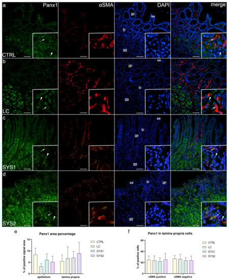 Co-expression of Panx1 and αSMA in the gastric mucosa of patients with SSc. CTRL—control samples from healthy volunteers (a); LC—samples from patients with limited cutaneous SSc (b); SYS1—samples from patients with moderate diffuse cutaneous SSc (c); SYS2—samples from patients with severe diffuse cutaneous SSc (d). se, surface epithelium; gp, gastric pits; gg, gastric glands; lp, lamina propria. Insets display Panx1 expression in lamina propria cells (a–d). Arrows mark αSMA-positive cells expressing Panx1, while arrowheads demonstrate αSMA-negative cells with Panx1 expression (a–d). DAPI staining shows all cell nuclei (a–d). Double immunofluorescence staining for Panx1 and αSMA, 200× magnification, scale bars: 200 µm. The graphs display differences in Panx1 area percentage of epithelium and lamina propria (e), as well as differences between αSMA-positive and -negative cells of the lamina propria (f). Error bars mark the standard deviation.