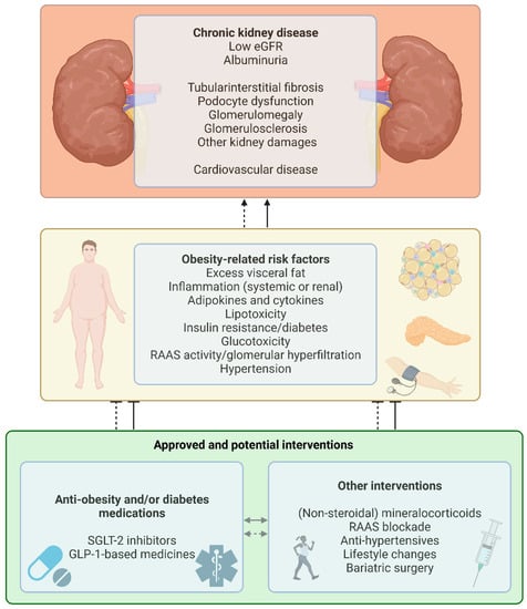 Regardless of the relative importance of other culprits such as diabetes, excess intra- and extrarenal fat tissue has specific negative consequences that can directly or indirectly cause or exacerbate poor kidney function. As suggested by García-Carro and colleagues, it is valuable to consider three main interrelated pathways as those that drive the negative consequences of obesity on the kidneys [44]: the adiposity pathway, the hemodynamics pathway, and a pathway involving the consequences of insulin resistance and hyperinsulinemia.