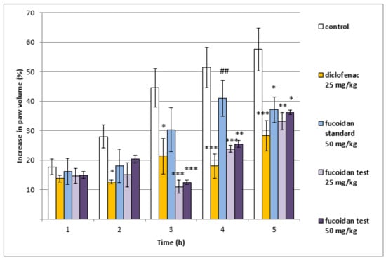 Forty male Wistar rats (weight 150–180 g) were allocated randomly into five groups (n = 8) and treated intraperitoneally. The rats of the 1st group (control) received 0.9% saline (0.1 mL/100 g bw), animals in in the 2nd group (diclofenac) received diclofenac sodium at a dose of 25 mg/kg bw, and the animals in the 3rd group (fucoidan standard) received 50 mg/kg bw fucoidan from Fucus vesiculosus. The experimental rats from the 4th group (fucoidan 25 mg/kg) received 25 mg/kg bw fucoidan from E. crinita, and those from the 5th group (fucoidan 50 mg/kg) received 50 mg/kg bw fucoidan from E. crinita. The injected volume was 0.1 mL/100 g bw. A subplantar injection of 0.1 mL of a 1% solution of degraded λ-carrageenan in saline was applied 1 h after treatment with the substances into the right hind paw. The paw volume was measured immediately before carrageenan injection and at the 1st, 2nd, 3rd, 4th, and 5th hour after the injection using a Plethysmometer apparatus (Ugo Basile, Gemonio, Italy) as described before [].