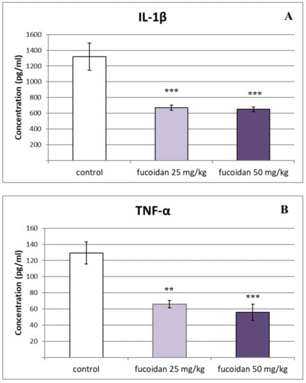 Subchronic treatment of rats with E. crinita fucoidan at a dose of 25 mg/kg bw induced a significant decrease in the serum levels of pro-inflammatory cytokines IL-1β (668.22 ± 32.93 vs. 1318.97 ± 171.14; p < 0.001), TNF-α (66.1 ± 4.57 vs. 129.33 ± 13.81; p < 0.01), and IL-6 (47.69 ± 4.06 vs. 121.08 ± 11.16; p < 0.001) in comparison to saline-treated rats with a model of LPS-induced systemic inflammation. We also observed reduced levels of IL-1β (650.28 ± 30.77 vs. 1318.97 ± 171.14; p < 0.001), TNF-α (55.79 ± 9.92 vs. 129.33 ± 13.81; p < 0.001), and IL-6 (60 ± 6.7 vs. 121.08 ± 11.16; p < 0.001) in rats injected for 14 days with fucoidan at a dose of 50 mg/kg bw when compared to control rats, as shown in Figure 2.