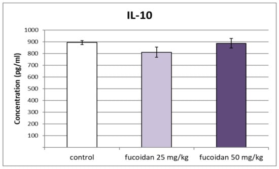Regarding the levels of the anti-inflammatory cytokine IL-10, our results showed no significant changes in its serum levels after treatment with fucoidan. In contrast, Saccharina japonica (formerly Laminaria japonica) (Phaeophyceae) fucoidan significantly increased the level of IL-10 in serum in rats with a model of myocardial infarction []. An elevated level of this cytokine after in vitro treatment of the Caco-2 cell line with low-molecular-weight fucoidan from Sargassum hemiphyllum was reported by Hwang et al. []. The observed differences could be explained by the different algal sources, as reported by Matsumoto et al. []. Fucoidan derived from Cladosiphon okamuranus Tokida decreased IFN-γ and IL-6 synthesis and increased levels of IL-10 in lamina propria of the colon, while no changes in the levels of these cytokines were observed after treatment with fucoidan from Fucus vesiculosus [].