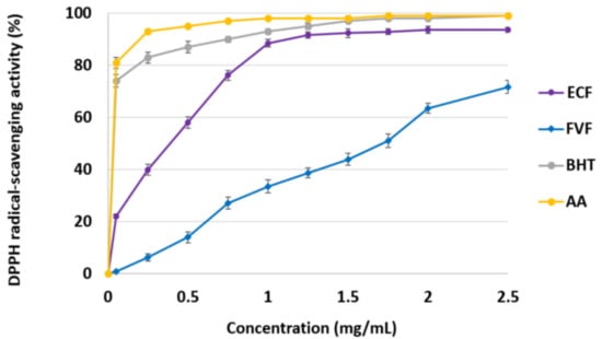 The DPPH radical scavenging activity of E. crinita fucoidan (ECF) was compared to commercial fucoidan from F. vesiculosus (FVF) and two conventional natural antioxidants: butylated hydroxytoluene (BHT) and ascorbic acid (AA). As shown in Figure 4, the inhibition percentage of polysaccharide samples showed a concentration-dependent pattern. At a concentration of 1.25 mg/mL, ECF reached inhibitory activity of 92%, while at the same concentration, FVF exhibited a 39% inhibitory activity. On the other hand, at concentrations of 1.25–2.5 mg/mL, the scavenging effect of ECF remained approximately within the same ranges (91.7–93.6%), while the inhibitory effect of FVF increased from 39% to 72%. Nevertheless, ECF and FVF (IC50 = 412 μg/mL and IC50 = 1.66 mg/mL, respectively) exhibited lower scavenging activities compared to both BHT (IC50 = 5.5 μg/mL) and AA (IC50 = 4.1 μg/mL).