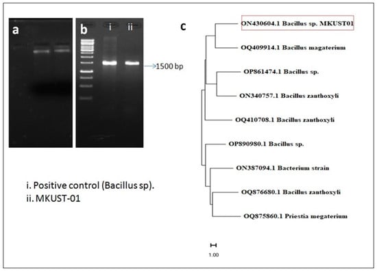 Figure 1. Gel electrophoresis and Phylogenetic tree of Bacillus sp. MKUST-01; (a) Genomic DNA, (b) Marker and PCR product, (c) phylogenetic tree of MKUST-01 strain.