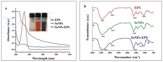 Figure 2. (a) Absorption spectrum of EPS, SeNPs, and SeNPs–EPS (inner image showed the colloidal suspension of EPS, SeNPs, and SeNPs–EPS). (b) FTIR spectrum of EPS (A), SeNPs (B), and SeNPs–EPS (C).