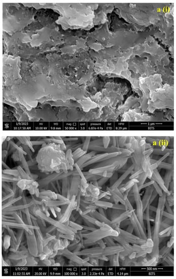 SEM images of EPS (Figure 3ai) showed compact, irregular porous, and stacked flakes of polysaccharide of Bacillus sp. MKUST-01. This kind of bacterial EPS helps the bacterial cells to adhere to each other due to the high-affinity interactions, which could play a vital role in conjugation with new substances [49,50]. The SeNPs show an amorphous spherical aggregate together with long rod-shaped particles (Figure 3aii), similar to the results of Zhang et al. [51]. These rod-shaped SeNPs are in the size ranging from 250 to 550 nm in length with a diameter of less than 70 nm. On the other hand, the morphology of the SeNPs–EPS showed flake-like morphology (Figure 3aiii), which is possibly due to the aggregation of rod-shaped SeNPs by virtue of the presence of EPS on their surface. The particles of SeNPs–EPS were connected and formed a regular colloidal structure. The earlier study demonstrate that the conjugation of polysaccharide with nanoparticle leads to notable improvements in the physicochemical and functional characteristics of these conjugate complexes [51].