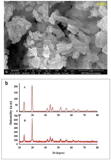 Figure 3. (a) SEM image reveals the morphology and size of EPS (i), SeNPs (ii), and SeNPs–EPS (iii). (b) X-ray diffraction pattern displays synthesized SeNPs (A) and SeNPs–EPS (B).