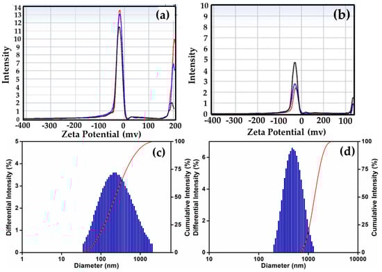 Figure 4. Zeta potential (a,b) and DLS (c,d); (a) SeNPs zeta potential, (b) SeNPs–EPS conjugate zeta potential, (c) SeNPs DLS, (d) SeNPs-EPS conjugate DLS (Note: Red, blue and block colour peaks are mean average of SeNPs).