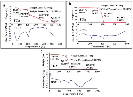 Figure 6. TGA and DSC analysis of bacterial (a) EPS, (b) SeNPs, and (c) SeNPs–EPS conjugate.