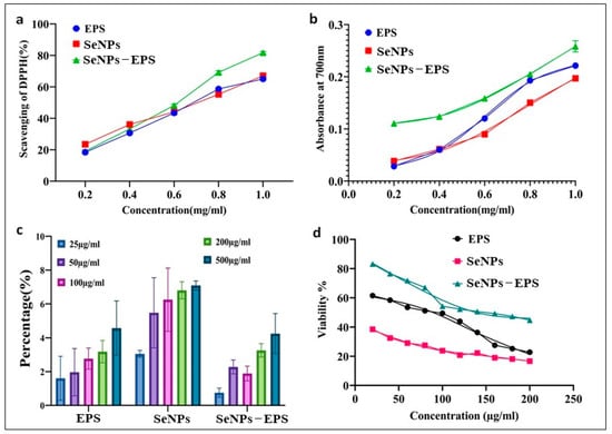 The antioxidant potentials of EPS, SeNPs, and SeNPs–EPS conjugates were measured using DPPH and total reducing power assay. The scavenging capacity of the EPS, SeNP, and SeNPs–EPS increased in the concentration range between 0 and 1.0 mg/mL as given in Figure 7a. Maximum activity of 82 ± 0.12% was observed with the concentration 1 mg/mL of SeNPs–EPS, in contrast with other samples. Increasing the concentration from 1 to 1.5 mg/mL could not significantly enhance the scavenging effect. Likewise, EPS from Leuconostoc mesenteroides WiKim32 exerts the scavenging activity on DPPH radicals and ferric ions reducing antioxidant power. Chen et al. [59] reported SeNPs stabilized with chitosan (50 nm size) exhibited significant DPPH and ABTS scavenging abilities. Additionally, Peng et al. [60] found that SeNPs ranging size from 5–200 nm were capable of directly scavenging free radicals in vitro, and this activity was shown to depend on the size of the SeNPs, understanding the importance of NPs size in their biological activity. The total reducing power of SeNPs and SeO2 demonstrated a dose-dependent trend within the concentration range of 0–1 mg/mL (Figure 7b). Across all concentrations, it is worth noting that the reducing power of EPS and SeNPs–EPS were notably lower than that of SeNPs (p < 0.05). However, when the concentration exceeded 1 mg/mL, then the reducing power of both EPS and SeNPs–EPS became significantly higher than that of SeNPs (p < 0.05). This increase in reducing power can be attributed to the solubility of EPS [54,61].