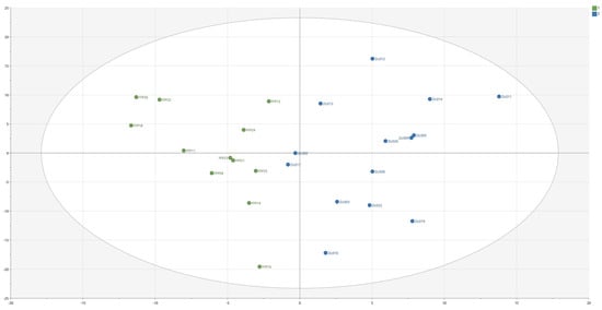 First, an unsupervised PCA model was computed for overview and quality control of the data using 444 metabolomic features as X-variables (n = 28, 444 X-variables, R2 = 0.49, Q2 = 0.27). Two patients were identified as strong outliers and were therefore excluded from further analyses. As shown in the Supplementary Materials S1, the contribution plot of one of them revealed that the features contributing most to the position of that individual in the PCA model were almost all related to glucose—and this was indeed the patient with concomitant diabetes (see Section 2.1).