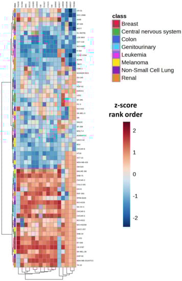 - Reinhold, W.C.; Sunshine, M.; Liu, H.; Varma, S.; Kohn, K.W.; Morris, J.; Doroshow, J.; Pommier, Y. CellMiner: A web-based suite of genomic and pharmacologic tools to explore transcript and drug patterns in the NCI-60 cell line set. Cancer Res. 2012, 72, 3499–3511. [Google Scholar] [CrossRef] [PubMed]