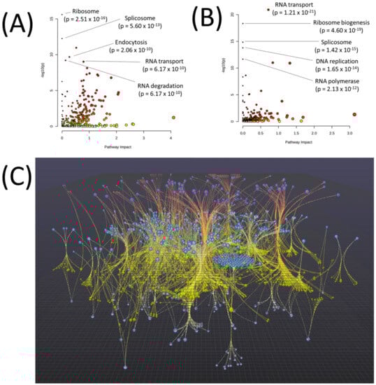 Joint pathway analysis was performed using metabolites, transcripts, and proteins with p < 0.1 between Q1 and Q4 to determine the overall differentiating cellular processes between the two groups. Joint pathway analysis with metabolites and transcripts revealed ribosome (p = 2.51 × 10−16), splicosome (p = 5.60 × 10−13), endocytosis (p = 2.06 × 10−10), RNA transport (p = 6.17 × 10−10), and RNA degradation (p = 6.17 × 10−10) as among the most significant pathways differentiating Q1 and Q4 (Figure 2A). Joint pathway analysis using metabolites and proteins revealed RNA transport (p = 1.21 × 10−21), ribosome biogenesis (p = 4.60 × 10−19), splicosome (p = 1.42 × 10−15), DNA replication (p = 1.65 × 10−14), and RNA polymerase (p = 2.13 × 10−12) as among the most significant pathways differentiating Q1 and Q4 (Figure 2B). To identify a focused set of molecules and pathways that distinguished between Q1 and Q4, Omicsnet—a powerful tool for integrated pathway network analysis using the KEGG database—was employed using metabolites, transcripts, and proteins with p < 0.1 between Q1 and Q4 (see Figure 2). This approach leverages established biological relationships among proteins, transcripts, and metabolites, constructing a core group of molecules based on the input lists. By doing so, the pathway analyses prioritize molecules that exhibit meaningful connections with each other, effectively excluding outlier molecules lacking strong associations with the overall set, while also considering “guilt by association” molecules that are known to interact with the input list [19]. This method ensures a more refined and relevant analysis of pathways related to the observed differences between Q1 and Q4. Results from the network analysis identified 86 pathways with an FDR-corrected p-value < 0.05 (full lists of all pathways from Figure 2 can be found in Supplemental Table S3). The top fifteen pathways from this analysis contained several resistance pathways as well as multiple metabolic processes related to nucleotides (purine and pyrimidine metabolism), carbohydrates (glycolysis/gluconeogenesis, pentose phosphate pathway), and select amino acids/peptides (arginine, proline, lysine, histidine, and glutathione metabolism) (Table 2).