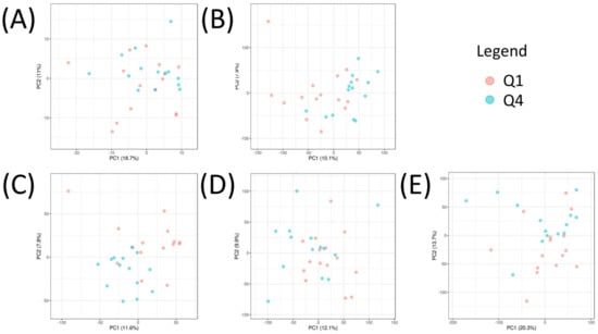 PCA of (A) metabolomics, (B) transcriptomics, (C) proteomics, (D) CNVs, and (E) DNA methylation values of Q1 (red) and Q4 (blue) samples. All datasets were autoscaled.