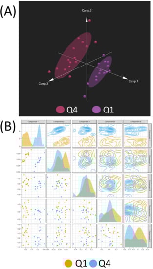 To unravel the intricate relationship between the omics datasets and pinpoint the most influential combination of predictors distinguishing Q1 and Q4, a multivariate analysis was conducted using Omicsanalyst. Initially, each omics dataset (metabolomics, transcriptomics, proteomics, CNVs, and DNA methylation) was analyzed separately using PCA. This analysis revealed the separation of Q1 and Q4 in each dataset in an unsupervised manner (Figure 3A–E). Results showed the strongest visual separation of Q1 and Q4 in the proteomics, transcriptomics, and DNA methylation datasets, whereas the separation in the metabolomics and CNV datasets was more modest. DIABLO was then used to perform an integrated, supervised analysis between Q1 and Q4. The DIABLO analysis revealed a clear separation between Q1 and Q4 with the first component of the model exhibiting the most robust separation of the two groups (Figure 4A,B). For each variable (metabolite, transcript, protein, CNV, methylated gene), loading scores were obtained using this model. A cutoff of >|0.6| for the loadings value in the first component was applied to identify significant variables. As a result, 18 metabolites, 567 transcripts, 69 proteins, 118 CNVs, and 43 methylated genes were identified as key factors contributing to the differentiation between the two groups (Supplementary Table S4).