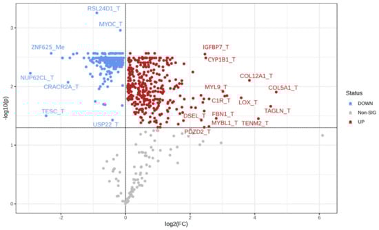 Volcano plot of variables with loadings values > |0.6| in PC1 of the DIABLO model. Colored dots represent variables with an FDR-adjusted p-value < 0.05 between Q1 and Q4 samples. Red dots represent upregulated variables, and blue dots represent downregulated variables in Q4 as compared to Q1. Variables ending in “_T” indicate those that are derived from the transcriptomics dataset, and variables ending in “_Me” indicate those that are derived from the DNA methylation dataset.