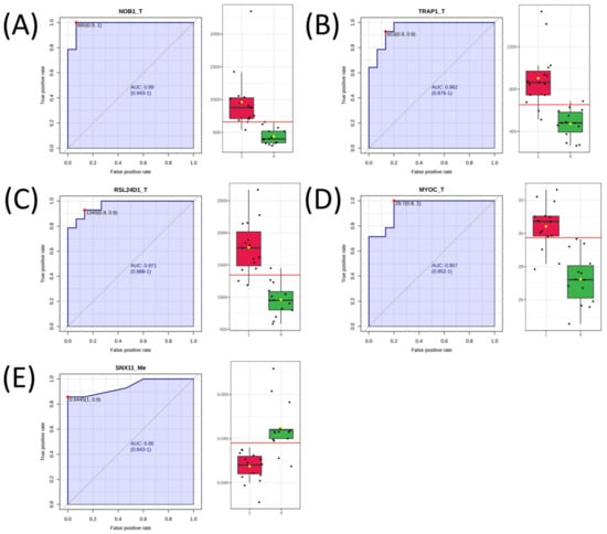 ROC curves of the top 5 DIABLO-selected variables that predict antifolate quartile status. (A) ROC curve of NOB1. (B) ROC curve of TRAP1. (C) ROC curve of RSL24D1. (D) ROC curve of MYOC. (E) ROC curve of SNX11. Variables ending in “_T” indicate those that are derived from the transcriptomics dataset, and variables ending in “_Me” indicate those that are derived from the DNA methylation dataset. Boxplots to the right of each ROC curve show the distribution of each variable in Q1 (red) and Q4 (green) samples.