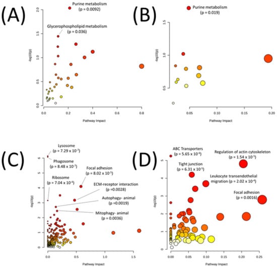 Joint pathway analysis of DIABLO-selected (A) metabolites and transcripts mapped to only metabolic pathways, (B) metabolites and proteins mapped to only metabolic pathways, (C) metabolites and transcripts mapped to all pathways, and (D) metabolites and proteins mapped to all pathways. Red points on the graph indicate a more significant pathway p-value.