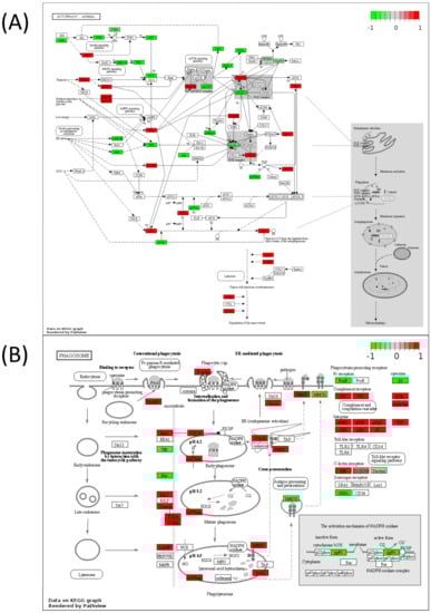 Pathview maps of (A) autophagy—animal and (B) phagosome KEGG pathways using variables with p < 0.1 between Q1 and Q4. Genes in red are increased in Q4, whereas genes in green are decreased in Q4.