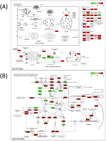 Pathview maps of (A) lysosome, and (B) regulation of actin cytoskeleton KEGG pathways using variables with p < 0.1 between Q1 and Q4. Genes in red are increased in Q4, whereas genes in green are decreased in Q4.