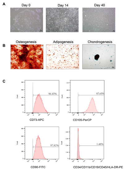 Characterization of human-induced pluripotent stem cell-derived mesenchymal stem cells (hiPS−MSCs) (A). Phase-contrast image of hiPS before differentiation (Day 0); Intermediate phase of MSCs differentiation from hiPS (Day 14); Typical morphology of MSC cells (Day 40). Original magnification 200×, Scale bar, 50 μm; (B). Multi-lineage differentiation of hiPS−MSCs. Alizarin Red, Alcian blue, and Oil red staining were used for osteogenesis, chondrogenesis, and adipogenesis. Original magnification 40×, Scale bar, 200 μm; (C). Flow cytometry analysis of the positive surface markers CD73, CD90, CD105, and negative surface markers CD34, CD45, CD11b, CD19 and HLA-DR in hiPS-MSCs.