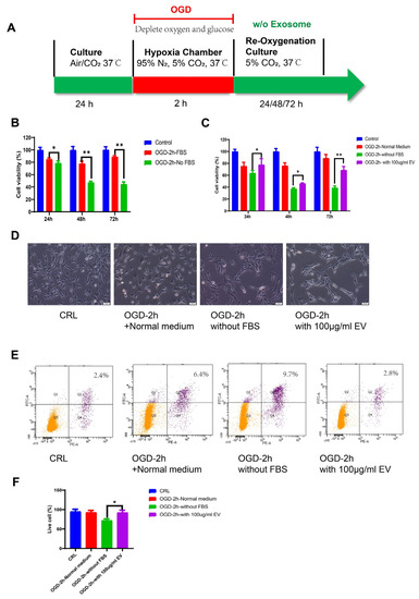 We next evaluated the effect of hiPS-MSC-EVs on cell viability and proliferation using a model of neuronal HT22 cells with oxygen-glucose deprivation/reoxygenation (OGD/R) in vitro (Figure 3A). To establish the OGD model, the cells were incubated in a hypoxia chamber for different periods, including 10 min, 20 min, 30 min, 1 h, 2 h, and 6 h. After OGD treatment, the cells were re-oxygenated in a 5% CO2 cell culture chamber for 24 h and examined by microscopy and proliferation assays. The results showed that the more prolonged OGD treatments (i.e., 6 h) led to dramatic apoptotic morphology and that proliferation decreased after re-oxygenation. The cells could not be recovered after the OGD treatment. In the 2 h OGD treatment, a significant decrease of absorbance at 490 nm (i.e., cell density) and minor morphology change was observed (Figure S1A). At the end of the reoxygenation period, cell viability was examined using the MTT assay at different times, specifically 24 h, 48 h, and 72 h. Our analysis revealed that the viability of HT22 cells was markedly decreased in OGD/NO FBS compared to the positive control OGD/FBS group, which indicated the cellular ischemic model was successfully established (Figure 3B, statistical test in Table S1).
