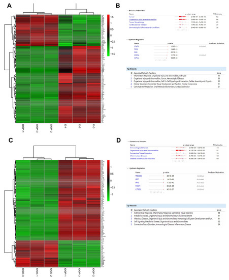 We evaluated differentially expressed genes (DEGs) using a heatmap and hierarchical clustering of RNA-seq data. The heatmap revealed the expression patterns of the top 100 DEGs of the samples clustered according to biological replicates within the OGD (n = 3) and control (n = 3) groups (Figure 4A). The comparison dataset from the two groups was submitted to the IPA tool for core analysis to allow further understanding of the biological functions and pathways involved and to test whether the DEGs genes are associated with the regulation of ischemia. Several diseases and disorders were identified with this approach, including cancer, organismal injury and abnormalities, tumor morphology, cardiovascular disease, and dermatological diseases associated with the upstream regulators STAT3, TP53, PGR, CEBPA, and HIF1A. The top 5 associated networks were also ranked based on this dataset (Figure 4B). The heatmap displayed the expression profile of 100 DEGs by comparing the OGD and OGE groups (Figure 4C).