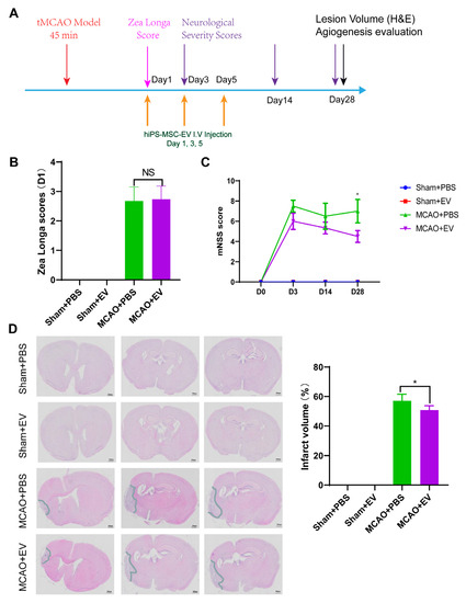 hiPS-MSC-EVs influence ischemic stroke volume and animal behavior in the mouse model of middle cerebral artery occlusion (MCAO). (A). Schematic representation of the establishment of the MCAO model and hiPS-MSC-EVs treatment. (B). Zea longa score evaluation. Two-way ANOVA test (n = 4 per group). (C). mNSS score evaluation. Two-way ANOVA test (n = 4 per group). (D). The lesion volume included all injury-related changes visible using H&E staining. Column displayed the quantification of lesion volume (n = 5 per group). Original magnification 20×, Scale bar, 500 μm; Student t test. In all panels, data were expressed as means ± SD, NS represents no significance, * p < 0.05.