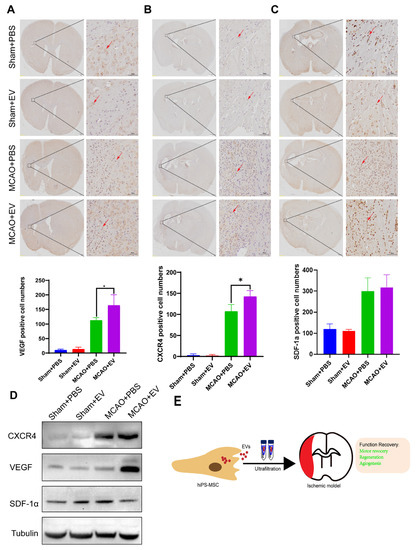 hiPS-MSC-EVs promote angiogenesis in the infarcted hemisphere. (A). Immunohistochemical analysis of VEGF in the infarcted hemisphere and quantification analysis of VEGF were performed (n = 6 per group). Positively stained cells are brown (indicated by the red arrow). (B). Immunohistochemical analysis of CXCR4 in the infarcted hemisphere and quantification analysis of CXCR4 were performed (n = 6 per group). Positively stained cells are brown (indicated by the red arrow). (C). Immunohistochemical analysis of SDF-1 in infarcted hemisphere. Quantification analysis of SDF-1 was performed (n = 6 per group). Positively stained cells are brown (indicated by the red arrow). (D). The expression of SDF-1, CXCR4, and VEGF was determined by western blot analysis. (E). Schematic representation of hiPS-MSC-EVs function in the ischemic mice model. Original magnification 20×, Scale bar, 500 μm; Inset magnification 200×, Scale bar, 50 μm. In all panels, data were expressed as means ± SD, * p < 0.05).