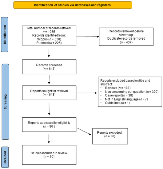 The results of the literature search that we performed are summarized in Figure 1 which shows the PRISMA flowchart of this study. A total of 1055 published papers were retrieved at the initial database search: 225 were obtained by searching PubMed and 830 searching Scopus. Four hundred thirty-seven records were duplicated in the two databases and, therefore, after correcting for duplication, the total number of papers that were considered for title and abstract analysis was 618. After excluding the publications not complying with inclusion criteria, 86 records were considered suitable for full-text analysis. After reading these papers and examining their content the two reviewers identified 50 papers [21,22,23,24,25,26,27,28,29,30,31,32,33,34,35,36,37,38,39,40,41,42,43,44,45,46,47,48,49,50,51,52,53,54,55,56,57,58,59,60,61,62,63,64,65,66,67,68,69,70] as suitable for inclusion in the systematic review, whereas the remaining 36 [71,72,73,74,75,76,77,78,79,80,81,82,83,84,85,86,87,88,89,90,91,92,93,94,95,96,97,98,99,100,101,102,103,104,105,106] were excluded since they were not compliant with one or more of the inclusion or exclusion criteria.