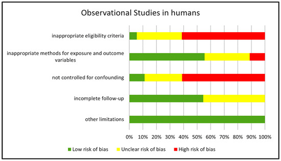 The risk of bias of observational studies in humans was evaluated using the Grade Criteria which consider five different categories of bias: (1) Inappropriate eligibility criteria; (2) Inappropriate methods for exposure and outcome variables; (3) Not controlled for confounding; (4) Incomplete or inadequate follow-up; (5) Other limitations [20]. For all the observational human studies the risk related to the aforementioned risk categories was conjunctly rated by A.M. and M.C. as either “no risk”, “unclear risk” or “high risk” and the results obtained were reported in a tabular format both as average percentage for the whole group of papers and as individual data for the single studies.