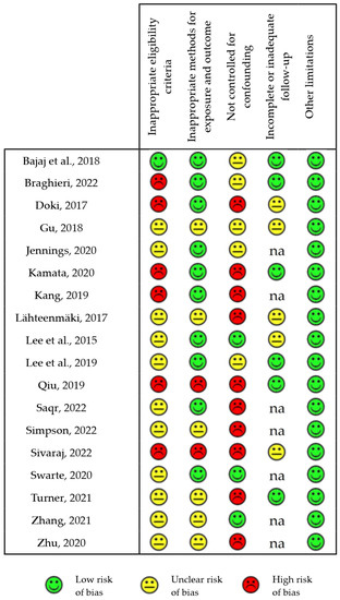 Risk of bias of observational human studies [21,22,24,27,28,29,32,33,35,38,40,41,54,55,56,60,64,65]. The chart reports the risk of bias for each of the individually estimated GRADE categories in all the reviewed human observational studies and classified as “low”, “unclear” or “high”. na: not applicable.