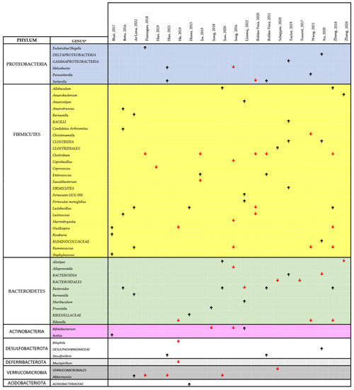 Comprehensive view of the effect of cIMDs on bacterial composition of the intestinal microbiota in human studies [33,41,54,55,56,59,60,64,65]. The chart shows the main alterations in the composition of the intestinal microbiota at the genus level as identified in the text and/or tables of the respective papers. The black upward and the red downward arrows indicate respectively an increase or a decrease in the relative abundance of the respective bacterial genus. For reasons of space and to make the chart readable, we could not include all the data reported in each paper or in their supplementary information, but we have focused on those on which the authors of each publication emphasized.