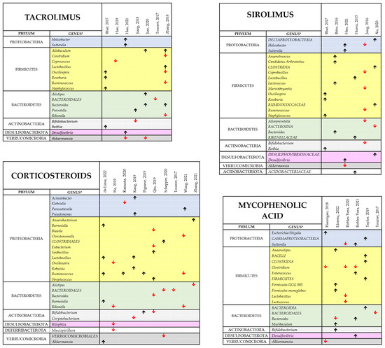 Comprehensive view of the effect of TAC, SIR, GCs and MMF bacterial composition of the intestinal microbiota [34,42,43,44,45,46,47,48,49,51,52,53,54,55,57,59,60,61,62,63,66,67,68,69,70]. The different panel show the main findings of the studies performed with each of the indicated cIMDs given alone to either experiment animals or human patients. The black upward and the red downward arrows indicate respectively an increase or a decrease in the relative abundance of the respective bacterial genus. No data have been reported for the other two cIMDs, CyA and EVERO since only one study was available for each of them. * Whenever available in the original publications, the data reported are related to changes observed at the genus level. When this information was not available, we reported the data at the closest classification level (order or family).