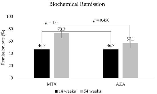 Proportions of patients by study group in biochemical remission after 14 and 54 weeks of therapy. MTX, methotrexate; AZA; azathioprine.