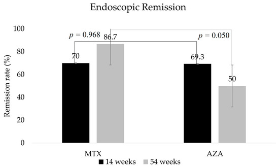 Proportions of patients by study group in endoscopic remission after 14 and 54 weeks of therapy. MTX, methotrexate; AZA; azathioprine.