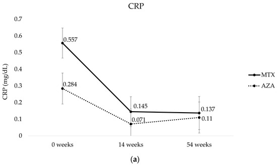 The mean CRP and fecal calprotectin levels during the study period are shown in Figure 3. There were no statistically significant differences between the two groups at baseline (CRP: AZA group 0.284 ± 0.093, MTX group 0.557 ± 0.09, p = 0.13; fecal calprotectin: AZA group 1440.73 ± 239.265, MTX group 1616.97 ± 239.265, p = 0.529), after induction (CRP: AZA group 0.071 ± 0.09, MTX group 0.145 ± 0.09, p = 0.252; fecal calprotectin: AZA group 305.533 ± 239.265, MTX group 480.867 ± 239.265, p = 0.425), and after one 1 year of treatment (CRP: AZA group 0.11 ± 0.093, MTX group 0.137 ± 0.099, p = 0.506; fecal calprotectin: AZA group 634.821 ± 247.44, MTX group 370.831 ± 266.783, p = 0.505).