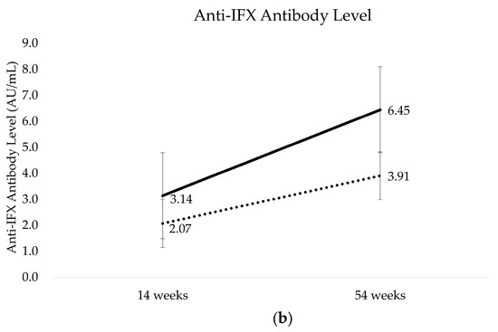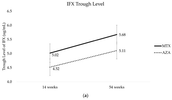 The trends in the IFX TLs over time during the treatment periods were similar for both medications, without any significant differences (Figure 4) (MTX group 5.68 ± 3.23 ug/mL, AZA group 5.11 ± 3.61 ug/mL, p = 0.686 at week 54). Similarly, in terms of the ADA levels, both drugs also showed similar trends, without any significant differences (MTX group 6.45 ± 5.61 AU/mL, AZA group 3.91 ± 2.12 AU/mL, p = 0.389 at week 54).
