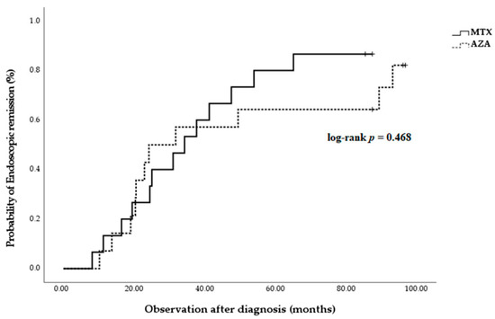 The Kaplan–Meier survival curves were also calculated, and there were no significant differences between the endoscopic (log-rank test p = 0.468, Figure 5), biochemical (log-rank test p = 0.557), or transmural remission rates (log-rank test p = 0.126) in the MTX and AZA groups.