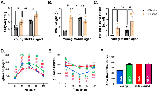Metabolic characteristics of young and middle-aged mice fed a normal chow diet (NCD) or a high-fat diet (HFD). In both young and middle-aged mice fed an HFD, body weight (A) and white adipose tissue (WAT) weight (B) were significantly increased compared to mice fed an NCD. However, there was no difference between young mice fed an NCD and middle-aged mice fed an HFD. Fasting plasma insulin levels (C) revealed the same pattern. Glucose tolerance (D) and insulin tolerance tests (E) showed that all mice had impaired glucose control compared to young mice fed an NCD. A comparison of the area under the curve (AUC) of the insulin tolerance test clearly showed differences among groups (F). In (D,E), statistical significances were calculated at each time point based on young mice fed an NCD. The corresponding group colors represent the statistical results of each group compared to young mice fed an NCD in blue: green for young mice fed an HFD, red for middle-aged mice fed an NCD, and purple for middle-aged mice fed an HFD. * indicates p < 0.05, # indicates p < 0.01, and ns indicates no significance. Data are presented as means ± SE.