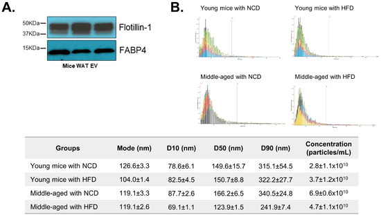 The characteristics of WAT-derived EVs were evaluated. The expression levels of Flotillin-1 (a general EV marker) and FABP4 (an adipocyte-derived EV marker) were measured to confirm EV characteristics (Figure 2A). A nanoparticle tracking analysis also showed that the size range of the majority of particles was within 100–300 nm (Figure 2B). Collectively, the results demonstrate that the obtained particles exhibit the distinctive characteristics of EVs derived from AT.
