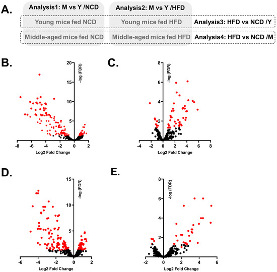 Four different DE-miRNA analyses and volcano plots of DE-miRNAs of each analysis. Schematic diagram displays four different combinations for analysis; Analysis1: M (middle-aged mice) vs. Y (Young mice)/NCD; Analysis2: M vs. Y/HFD; Analysis3: HFD vs. NCD/Y and Analysis4: HFD vs. NCD/M (A). Volcano plots demonstrate the expression patterns of DE- miRNAs in each analysis; Analysis1 (B), Analysis2 (C), Analysis3 (D), and Analysis4 (E). Dots in red indicate miRNAs with adjusted p-values < 0.05.