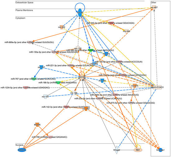 We also analyzed the effect of aging on miRNA profiles in HFD mice (Analysis2: M vs. Y/HFD). In contrast to the results of Analysis1: M vs. Y/NCD, the number of DE-miRNAs between groups was less (n = 52) and the changes were subtle. Also, most of the DE-miRNAs were upregulated in middle-aged mice (n = 44, Table 2, Figure 3C). From the pathway analysis, a strong inhibition of IGF1R was expected in middle-aged mice (Figure 4). Lastly, miRNA profiles of middle-aged mice were analyzed between HFD and NCD groups. In Analysis4: HFD vs. NCD/M, 33 DE-miRNAs were identified and 29 miRNAs were upregulated in the HFD group. A pathway analysis demonstrated a strong inhibition of Akt and CCND1 in the HFD group (Supplementary Figure S4).