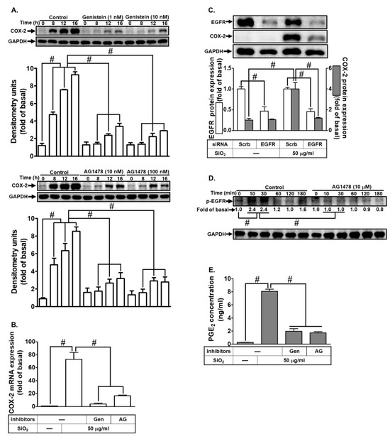 Figure 8). First and foremost, our results indicated that COX-2 expression in SiNPs-treated HTSMCs was abolished by the EGFR inhibitor (AG1478) and EGFR siRNA, suggesting that EGFR mediates SiNPs-induced COX-2 expression. Second, the downstream components of EGFR signaling responsible for this induction involve Pyk2, PKCα, p42/44 MAPK, and NF-κB. These findings are consistent with previous research linking EGFR-dependent signaling to the pathophysiology of asthma, an airway disease [