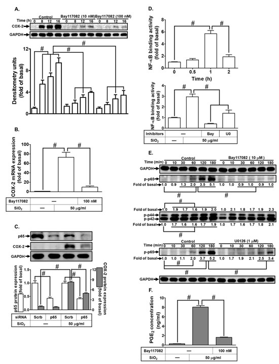 21]. In our current investigation, SiNPs-induced phosphorylation of p42/p44 MAPK was effectively inhibited by U0126 and the PKCα/β inhibitor, Gö6976, in HTSMCs. This observation suggests a hierarchical activation sequence wherein p42/p44 MAPK is downstream of PKCα in SiNPs-challenged HTSMCs. Moreover, the indispensability of NF-κB in SiNPs-induced COX-2 expression and PGE