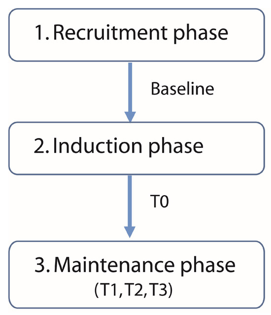 This was a retrospective study without a sham comparator. The protocol of the present study was derived from the literature [9] and from previous experience. It consisted of three main phases: (1) recruitment; (2) induction; and (3) maintenance (Figure 1).