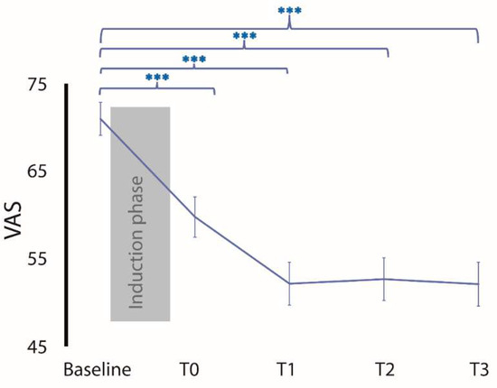 Timeline of “responder” group over 12 months. Grey area corresponds to the induction phase (10 days of tDCS). There was a significant decrease in pain intensity (VAS) over time after the induction phase. Effect persisted until T3. (Curly bracket refers to Conover’s post hoc test.) Values are shown as the mean ± standard error of the mean, *** p < 0.001.
